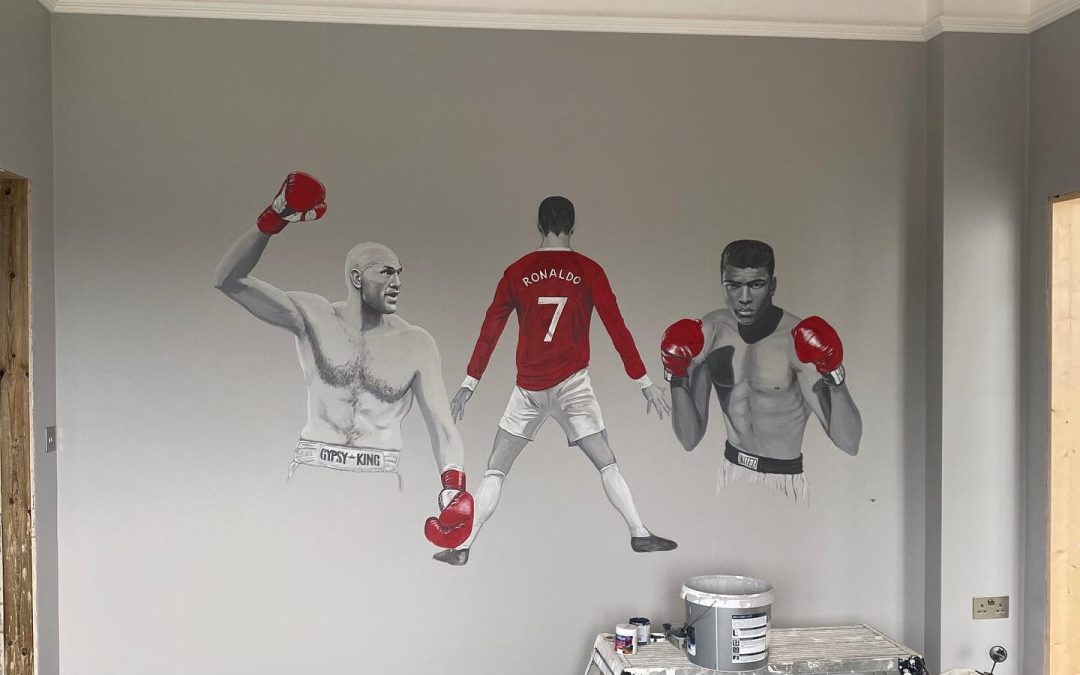 A Trio Mural of Sporting Heroes Boom! Three legends on one wall! This trio mural of sporting heroes consistst of Tyson Fury, Cristiano Ronaldo and the great Muhammed Ali. An aspirational mural for any active young boy. This mural was a lot of fun. I loved the black,...